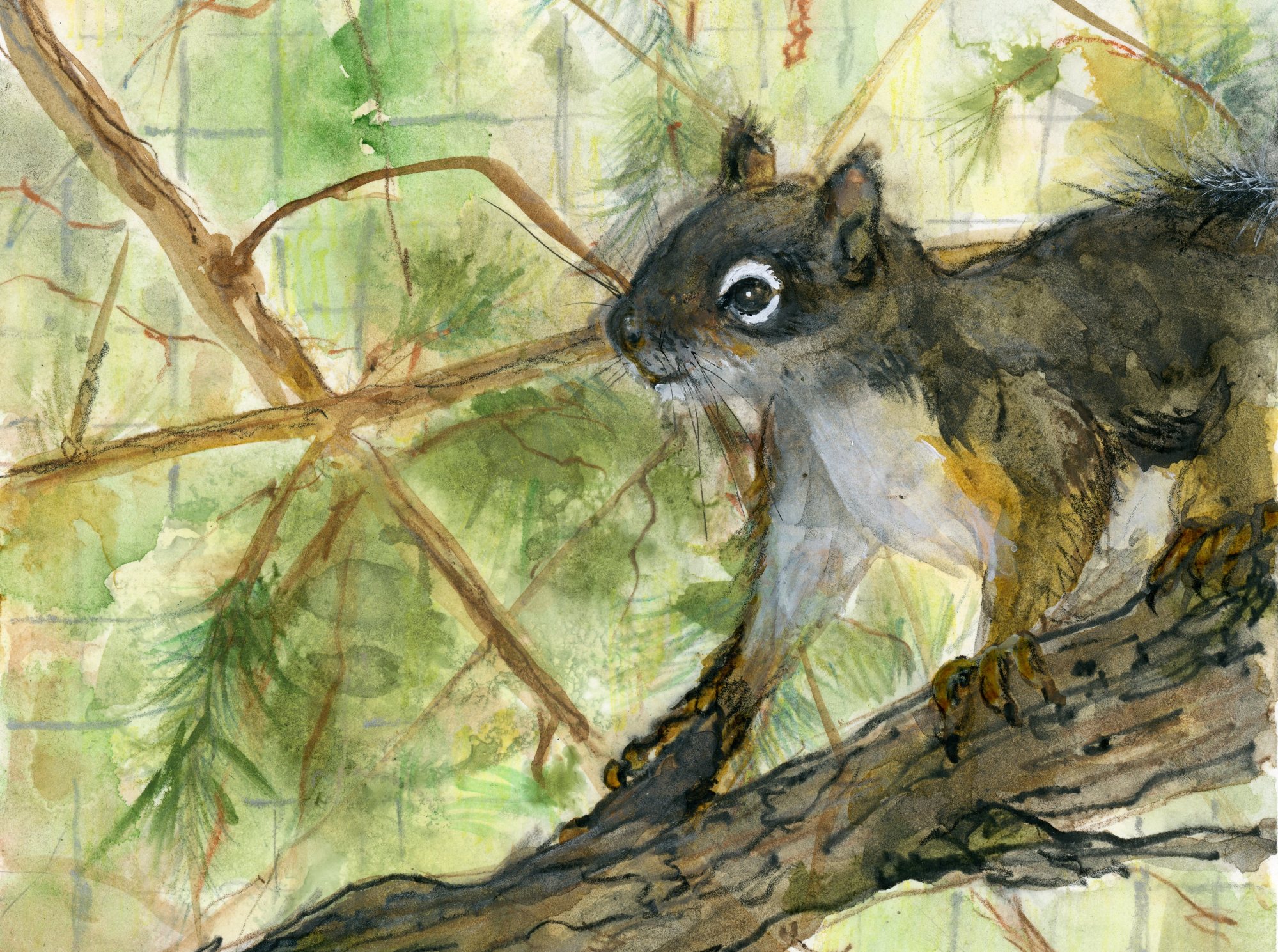 Willy was a delightful little Douglas squirrel who frequented our bird feeders one summer, making himself happy and content in the donut-shaped feeder attached to our deck. He would literally kick back, lean his elbow on the rim, and dig in to the varied seeds and nuts we placed there for him. He came to our deck at ten o’clock each morning like clockwork, and we fell in love with him. Annie, our collie, took notice of him too, and she would sometimes follow him along the deck looking very interested. Willy would tease her, bouncing along just in front of her.